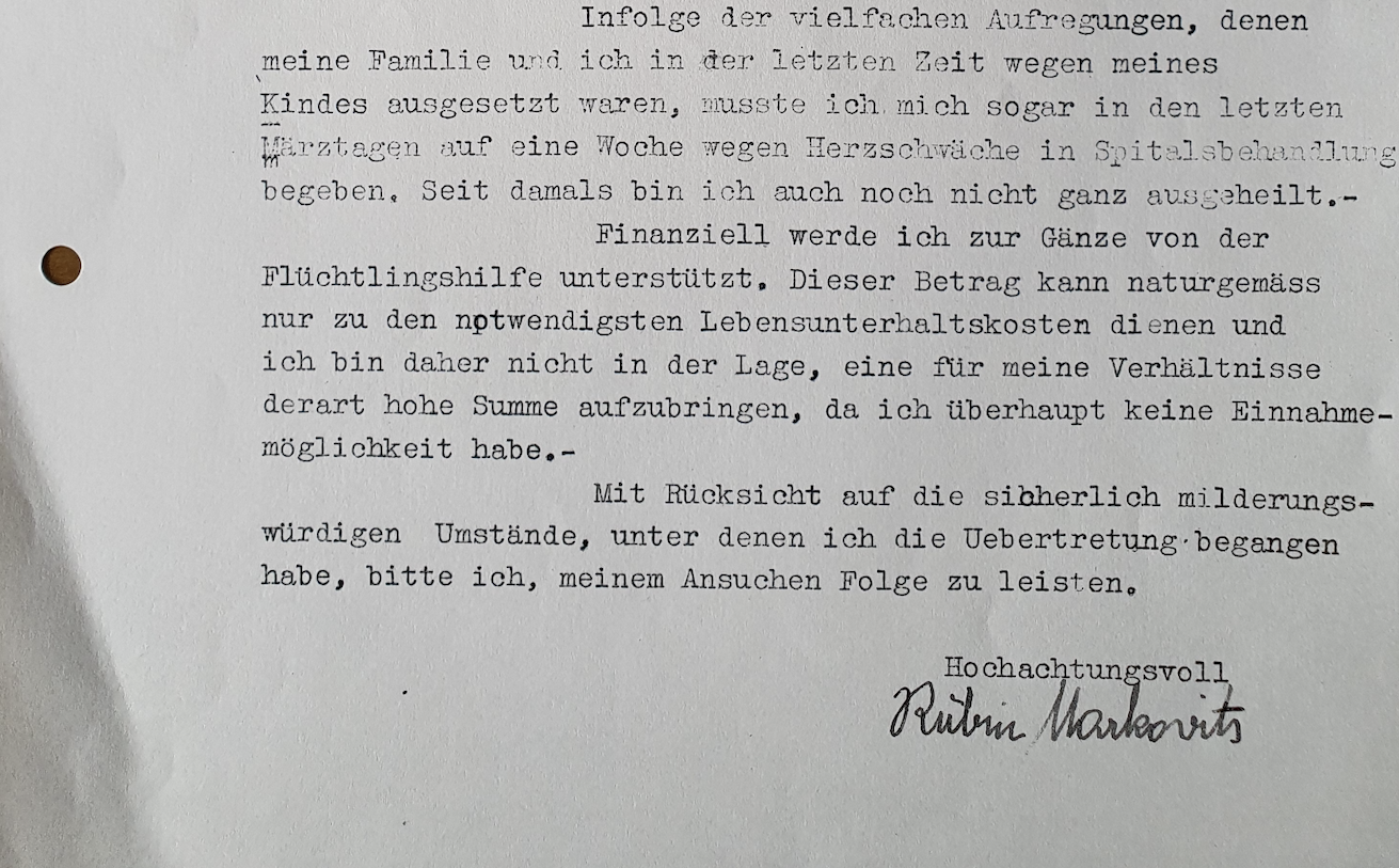 „Ich erkläre unumwunden, dass meine Verurteilung zu Recht erfolgt ist und dass ich die Gesetzesübertretung begangen habe, doch bitte ich in Betracht zu ziehen, in welcher Lage ich mich befand, als ich hörte, dass mein minderjähriges Kind schutzlos von den Eltern entfernt in Deutschland leben musste und ich überhaupt keine Hilfsmöglichkeiten für ihn hatte. (…) Finanziell werde ich zur Gänze von der Flüchtlingshilfe unterstützt. Dieser Betrag kann naturgemäss nur zu den notwendigsten Lebenserhaltungskosten dienen und ich bin daher nicht in der Lage, eine für meine Verhältnisse derart hohe Summe aufzubringen, da ich überhaupt keine Einnahmemöglichkeit habe.“[4]