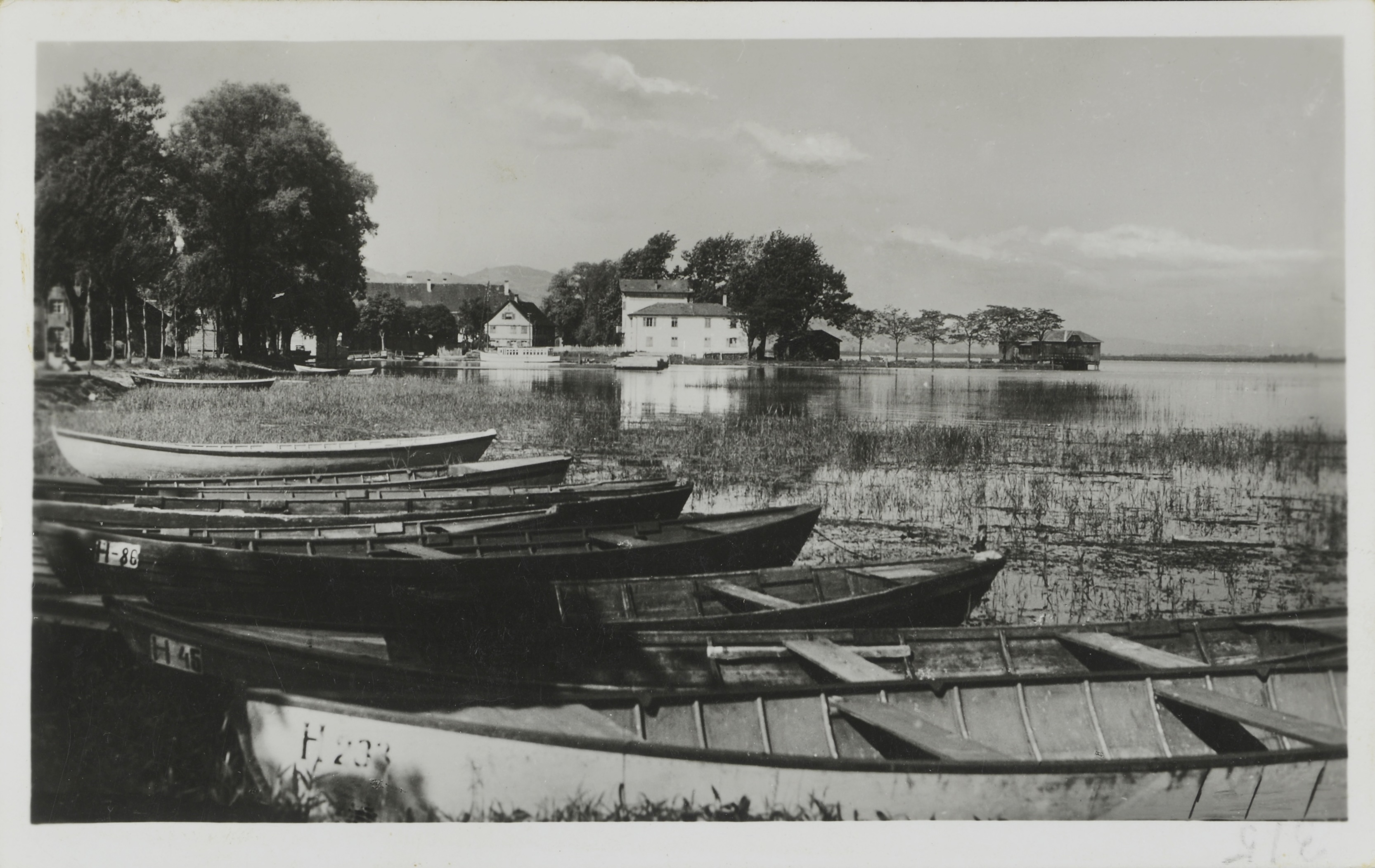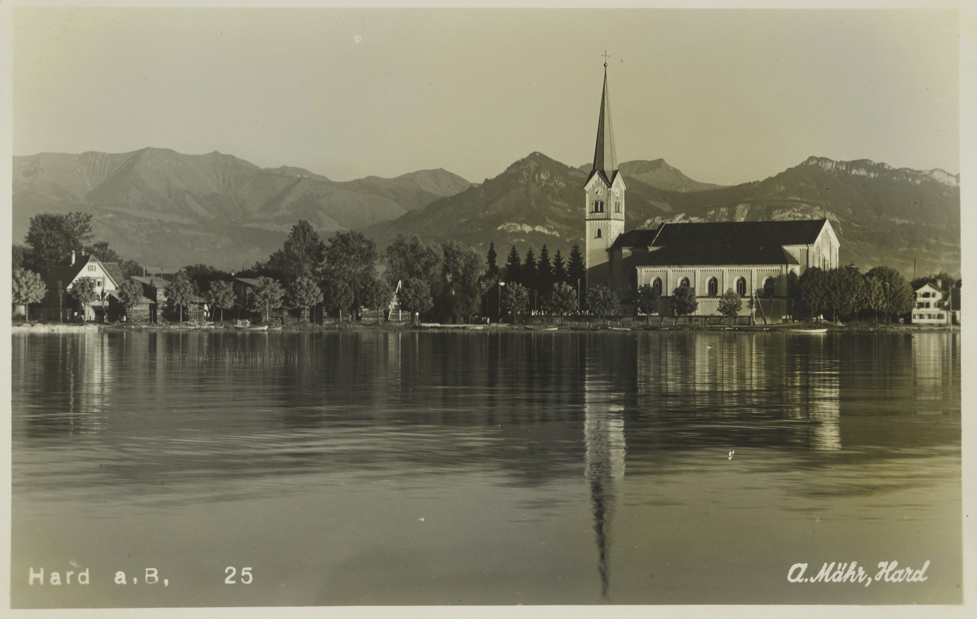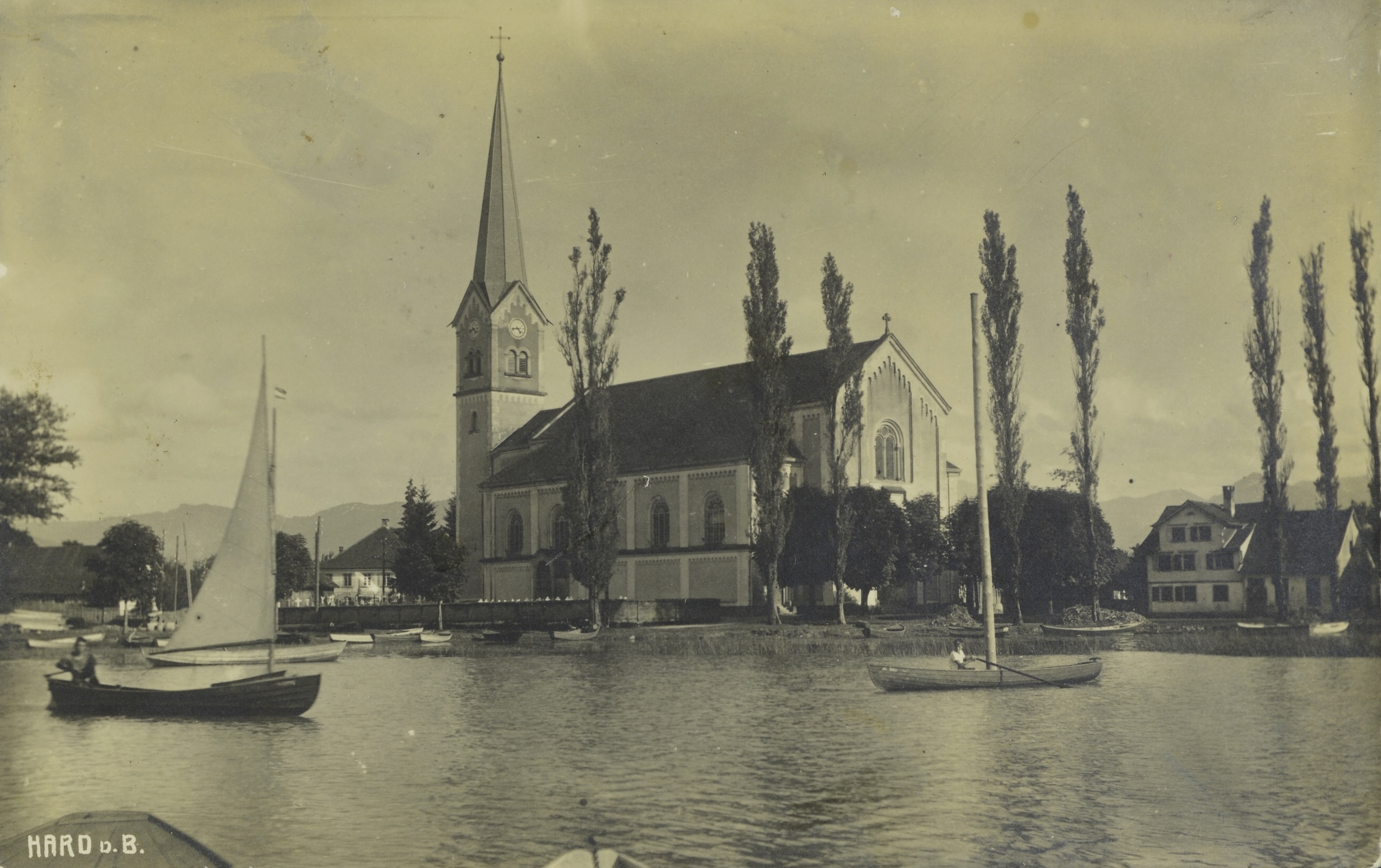„Nachdem wir gegessen hatten, gingen wir in die Ortschaft Hard und legten da im Gasthof ‚Zum Löwen‘ unsere Rucksäcke ab. Nun gingen wir zum See, um uns dort nach einem Boot umzusehen. Am Seeufer gegenüber der Kirche sahen wir auch […] ein Boot liegen, doch fehlten auch da wieder die Ruder.“[2]