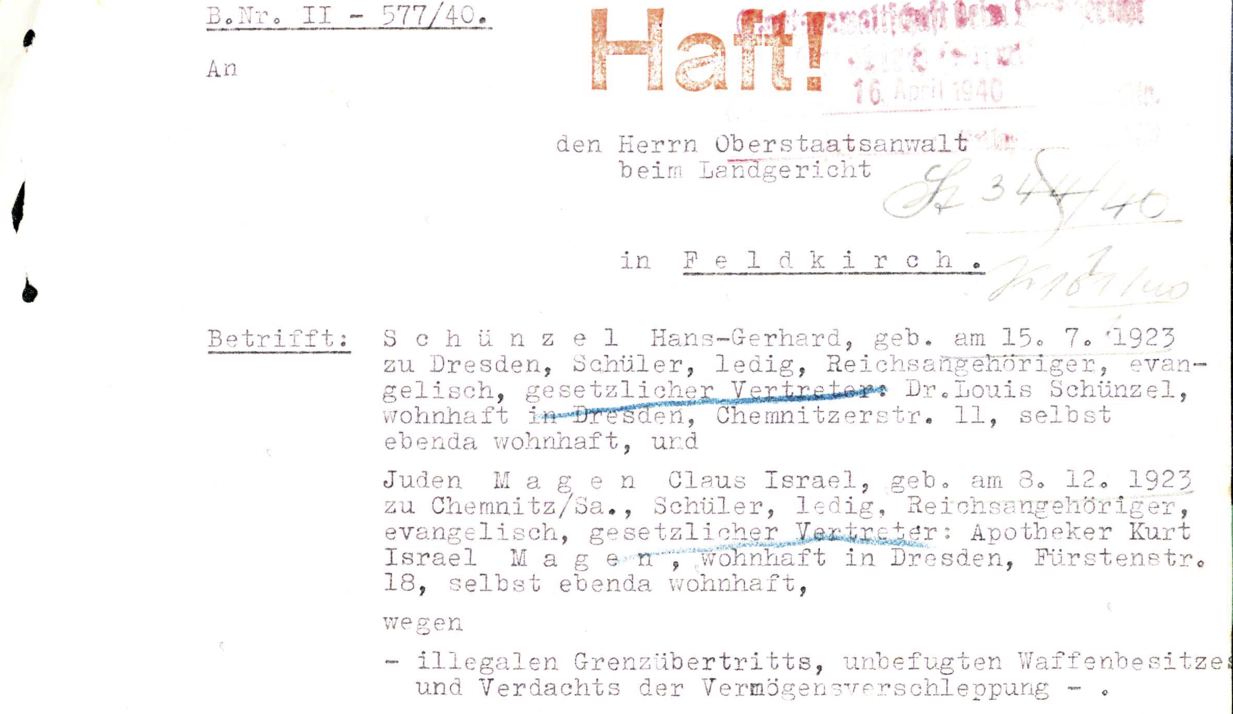 In einem Dresdner Gotteshaus, der ‚American Church of St. John‘, haben sich die fast Gleichaltrigen Claus Magen und Hanns-Gerd Schünzel knapp ein Jahr zuvor kennengelernt. Schünzel war eng mit dem Glauben verbunden und beteiligte sich als Ministrant an den sonntäglichen Gottesdiensten. Der Schüler strebte eine theologische Ausbildung in den USA an. Doch spätestens der Kriegsbeginn im September 1939 stellte diesen Plänen scheinbar unüberwindbare Hindernisse in den Weg. Mit einer Ausreiseerlaubnis konnte der junge Mann nicht mehr rechnen. So blieb nur mehr der illegale Grenzübergang. In dieses Vorhaben weihte er schließlich auch seinen Freund Claus Magen ein, der als Sohn des jüdischen Apothekers Kurt Magen ebenso einen Grund hatte das Land zu verlassen. Dass die Familie längst zum evangelischen Glauben konvertiert war, spielte für die Nazis keine Rolle. Drei Jahre lang hatte Claus Magen in St. Gallen ein Internat auf dem Rosenberg besucht. Doch im September 1938 wird dem Vater von der Devisenstelle mitgeteilt, dass sein Konto für Überweisungen ins Ausland gesperrt sei und kein Schulgeld mehr in die Schweiz überwiesen werden darf. Ende Oktober 1938 muss der vierzehnjährige Claus Magen nach Dresden zurückkehren, gerade rechtzeitig um am 10. November die Verhaftung seines Vaters und dessen Deportation nach Buchenwald zu erleben.[1] Nach drei Wochen zunächst entlassen, wurde sein Vater ein Jahr später nach dem Münchner Attentat auf Hitler erneut verhaftet, so wie hunderte andere unschuldige Menschen. Inzwischen war Claus Magen 16 Jahre alt und entschlossen sein Schicksal selbst in die Hand zu nehmen. Vor dem Kirchgang am Sonntag den 3. März 1940 vereinbarten Schünzel und er ihre Flucht. Eine Woche später machten sie sich mit dem Zug auf den Weg. Getrennt ging es nach München, zusammen dann weiter nach Lindau an den Bodensee, wo sie im Hotel Peterhof nächtigten.