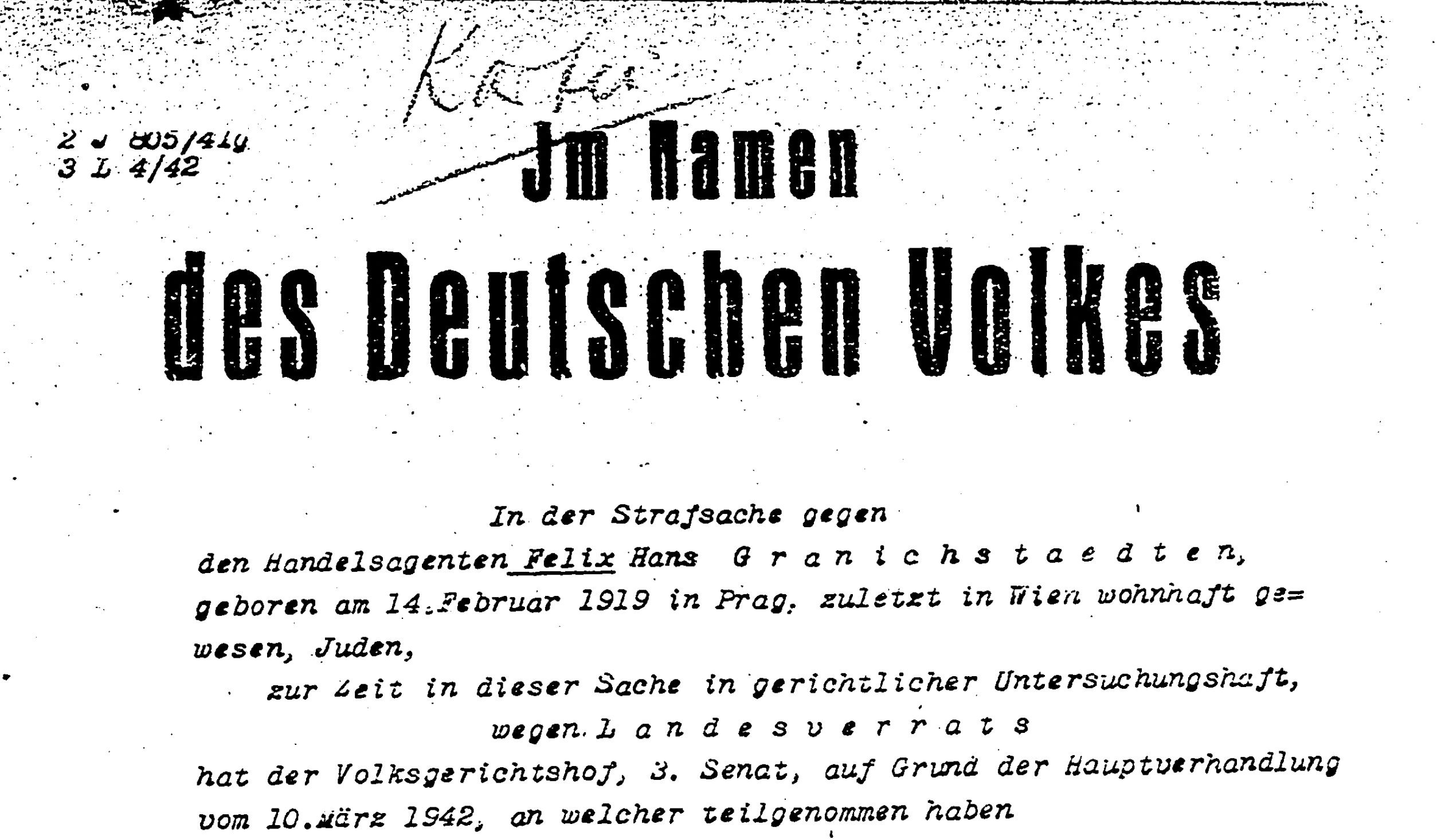 Felix Granichstaedten findet sich am 10. März 1942 hingegen in Berlin vor dem Volksgerichtshof des Deutschen Reiches wieder. Angeklagt wegen Landesverrat. Wie er von Diepoldsau dorthin gelangte, darüber gibt die Urteilsbegründung für sieben Jahre Zuchthaus akribisch Auskunft. Eine für die Verhältnisse des Nationalsozialismus fast schon Verständnis bekundende Urteilsschrift, die ihm freilich nicht helfen wird.