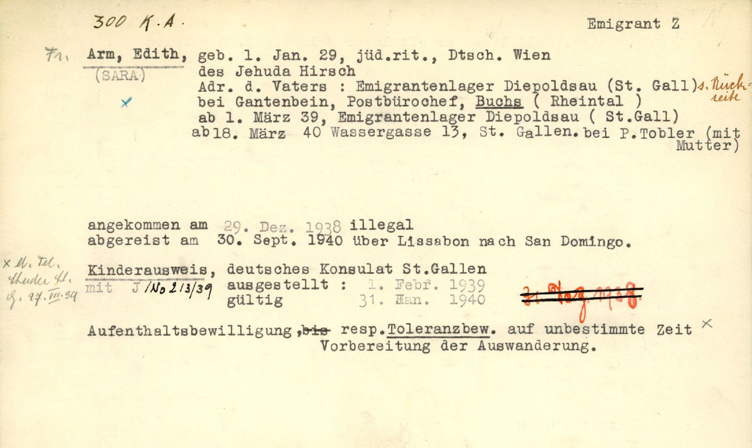 Josef Arm, der Vater, und sein Bruder Fritz waren am 27. November 1938 nach Diepoldsau geflohen. Wo es ihnen gelungen war, die Grenze zu überschreiten ist unbekannt, aber vom Flüchtlingslager aus schafften sie es, die Flucht von Edith und ihrer Mutter Elsa vorzubereiten. Am 29. Dezember, drei Tage vor Ediths zehntem Geburtstag, treffen auch sie im Flüchtlingslager Diepoldsau ein.