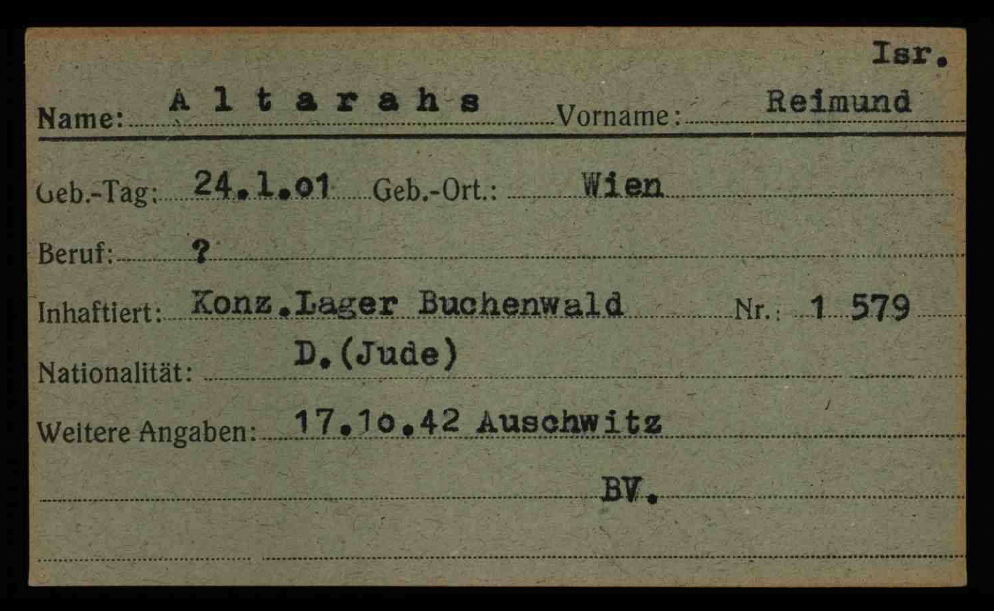 Ein gewisser Raimund Altaras, inzwischen Rentner von Beruf, soll wegen guter Führung aus der Haft entlassen werden. Die Direktion möchte wissen, ob die von ihm gemachten Angaben zu seiner KZ-Haft der Wahrheit entsprächen. Tatsächlich kann der Internationale Suchdienst des Roten Kreuzes darüber aufklären, dass Raimund Altaras bis zum 25. September 1939 als Häftling Nr. 34548 in Dachau inhaftiert war, danach bis zum 17. Oktober 1942 als Häftling Nr. 1579 in Buchenwald, wo er unter anderem im Strafkommando eingesetzt wird. Von dort wird er am 17. Oktober nach Auschwitz überstellt, als Häftling Nr. 68347 im Nebenlager Monowitz, das für den Chemie-Konzern IG-Farben arbeitet. Schließlich leistet er, ab dem 18. Januar 1944 noch ein Jahr Zwangsarbeit im Zementwerk des Auschwitz-Nebenlagers Golleschau.