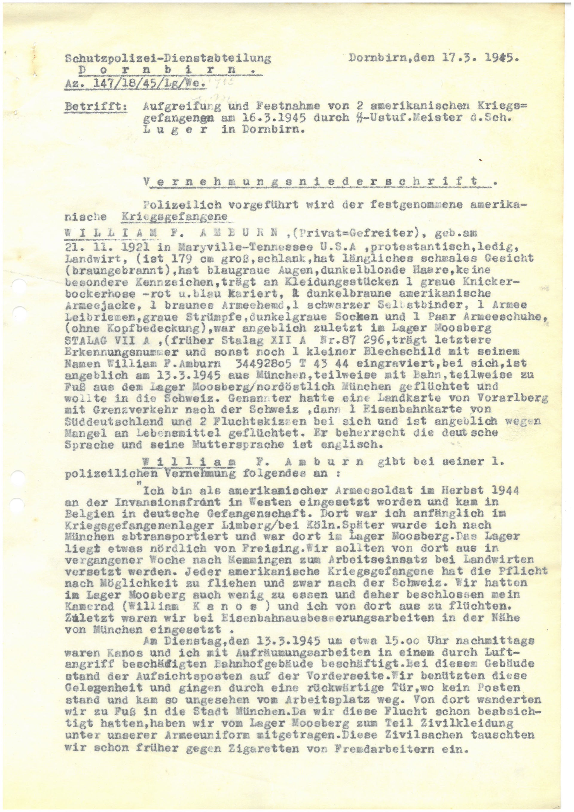 Polizeilich vorgeführt wird der festgenommene Kriegsgefangene William F. Amburn, geb. am 21.11.1921 in Maryville-Tennessee U.S.A., protestantisch, ledig, Landwirt. Ist angeblich am 13.3.1945 aus München, teilweise mit Bahn, teilweise zu Fuß aus dem Lager Moosberg (sic!)/nordöstlich München geflüchtet und wollte in die Schweiz. Genannter hatte eine Landkarte von Vorarlberg mit Grenzverkehr nach der Schweiz, dann 1 Eisenbahnkarte von Süddeutschland und 2 Fluchtskizzen bei sich und ist angeblich wegen Mangel an Lebensmittel geflüchtet. Er beherrscht die deutsche Sprache und seine Muttersprache ist Englisch.“[1]