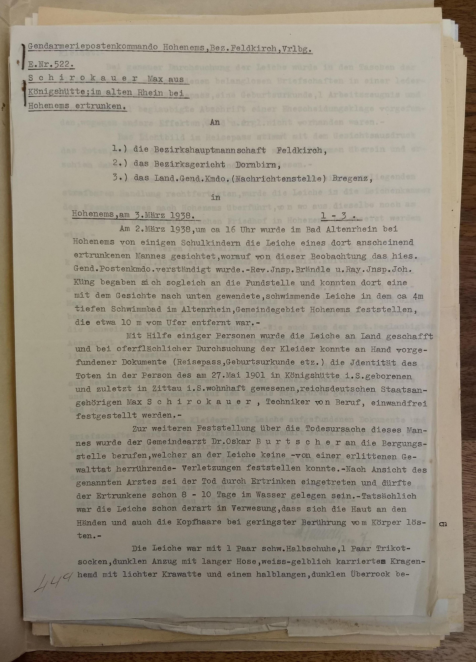 „Am 2. März, um ca. 16 Uhr wurde im Altenrhein bei Hohenems von einigen Schulkindern die Leiche des dort anscheinend ertrunkenen Mannes gesichtet, worauf von dieser Beobachtung das hiesige Gend(armerie) Postenkommando verständigt wurde.