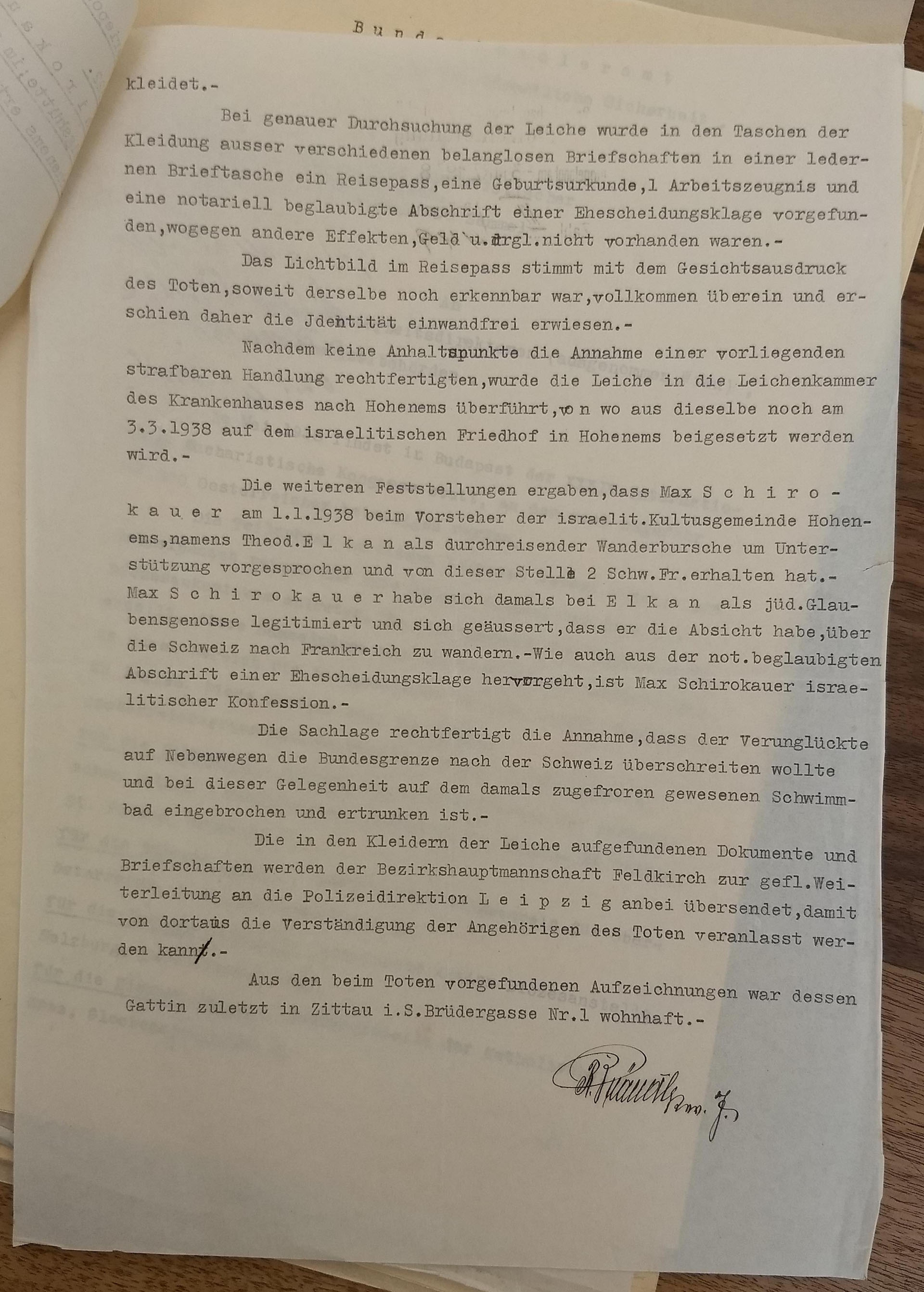 Der herbeigerufene Hohenemser Gemeindearzt Oskar Burtscher konnte keine Verletzungen feststellen. Anhand der Papiere, die er bei sich trug, konnte der Tote allerdings identifiziert werden. Max Schirokauer, Techniker von Beruf, musste etwa 10 Tage zuvor den Versuch unternommen haben, über das zugefrorene Hohenemser Schwimmbad in die Schweiz zu gelangen und war dabei offenbar eingebrochen und ums Leben gekommen.