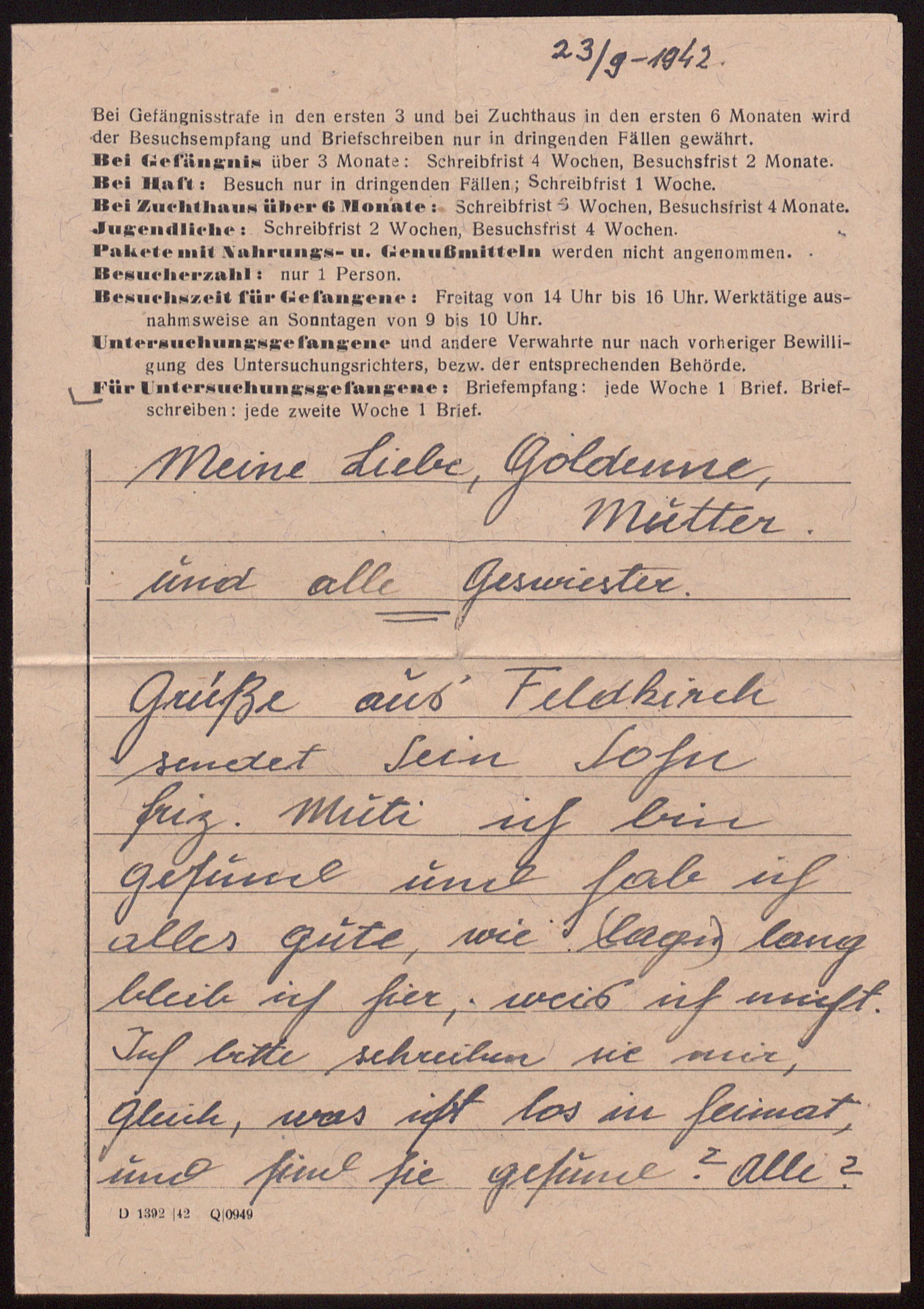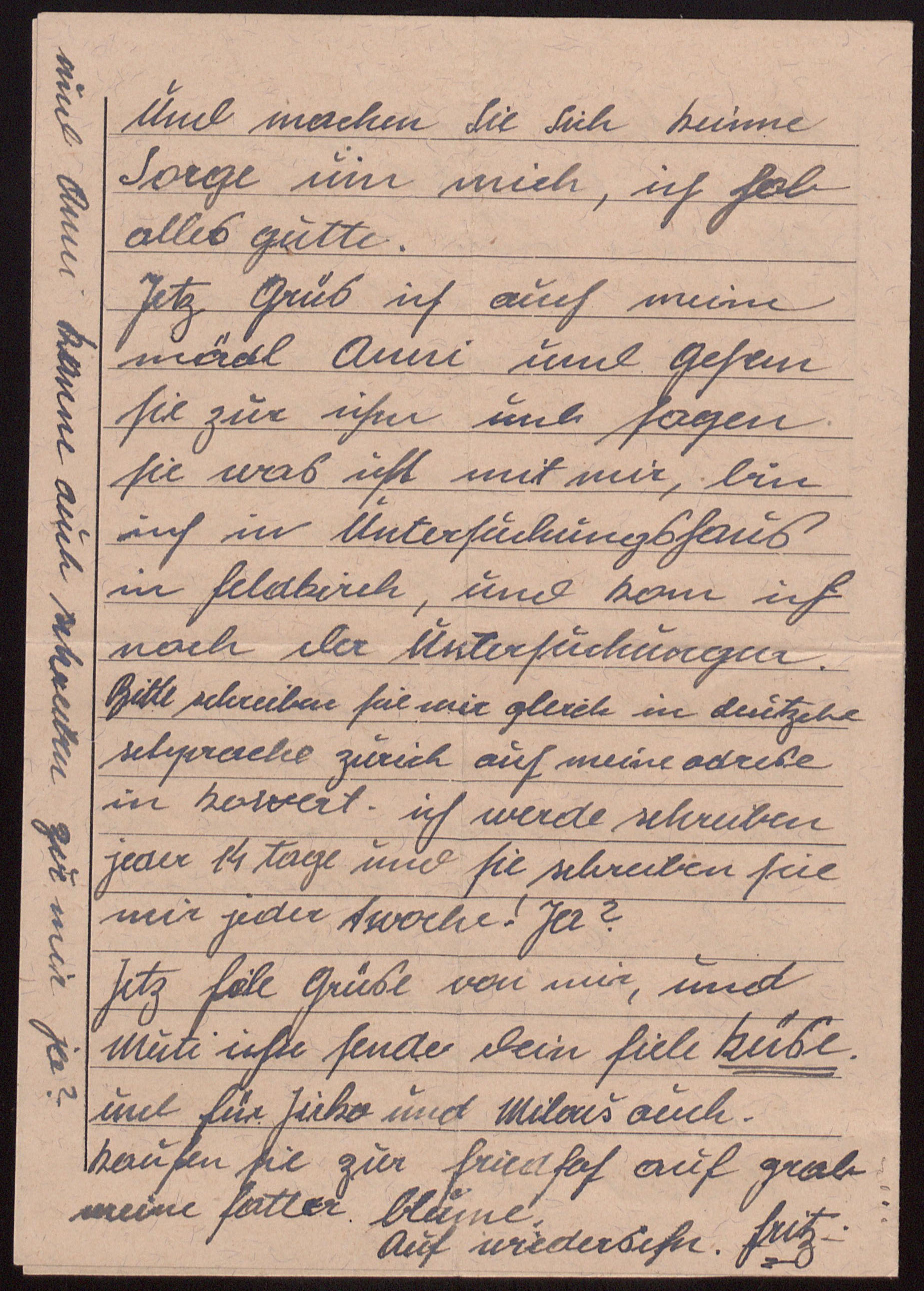 Jetzt Grüs ich auch meine mädl Anni und gehen sie zur ihm und sagen sie was ist mit mir, bin ich in Untersuchungshaus in Feldkirch, und kom ich nach der Untersuchungen. Bitte schreiben sie mir gleich in deutsche schprache zurick auf meine Adrese in kuwert. Ich werde schreiben jede 14 tage und sie schreiben sie mir jeder woche! Ja?