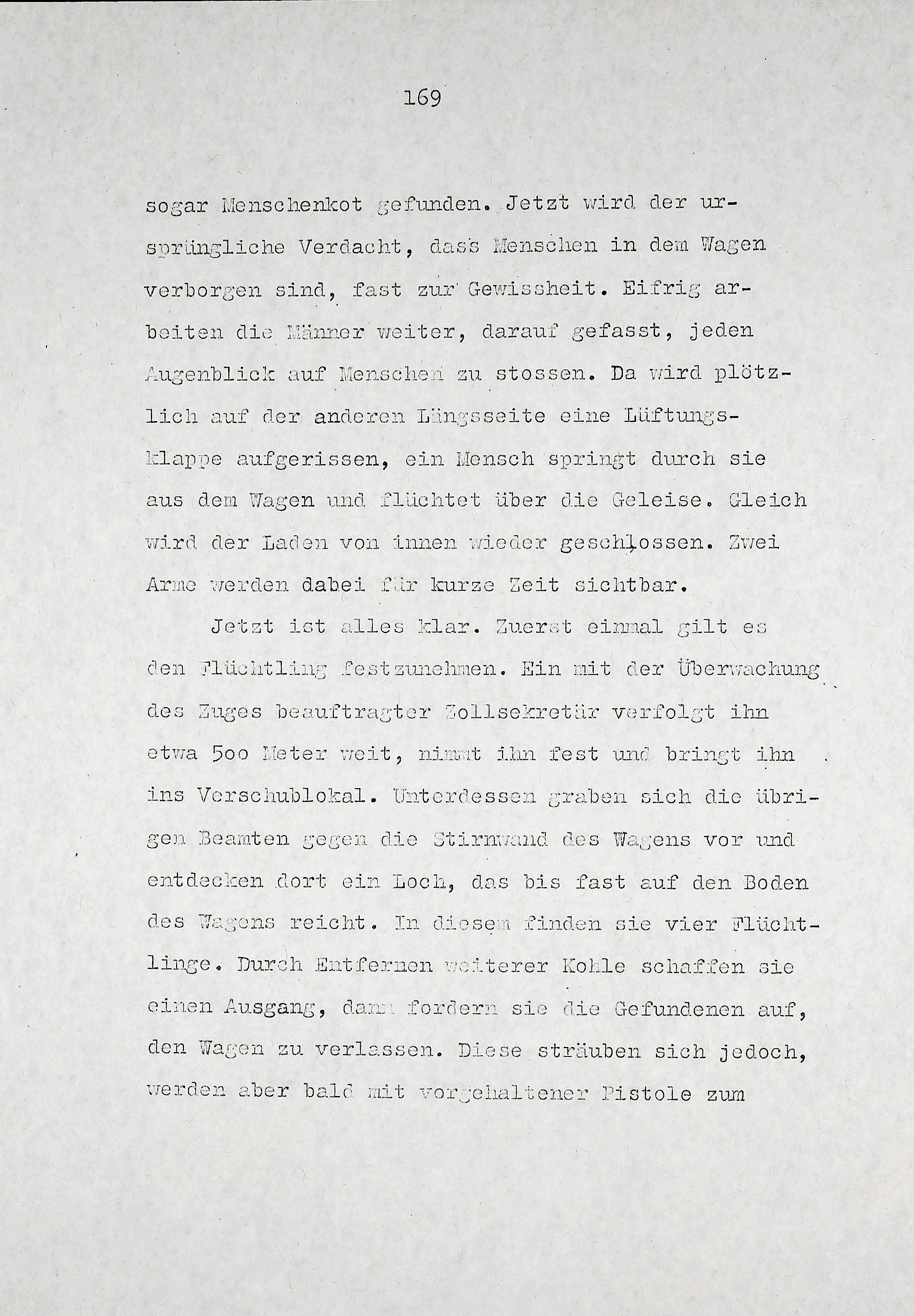 „Unterdessen graben sich die übrigen Beamten gegen die Stirnwand des Wagens vor und entdecken dort ein Loch, das fast bis auf den Boden des Wagens reicht. In diesem finden sie vier Flüchtlinge. Durch Entfernen weiterer Kohle schaffen sie einen Ausgang, dann fordern sie die Gefundenen auf, den Wagen zu verlassen. Diese Sträuben sich jedoch, werden aber bald mit vorgehaltener Pistole zum Herauskriechen gezwungen. Die Flüchtlinge sind vor Kohlenstaub ganz schwarz im Gesicht und dreckig, scheinen aber in guter körperlicher Verfassung zu sein.
