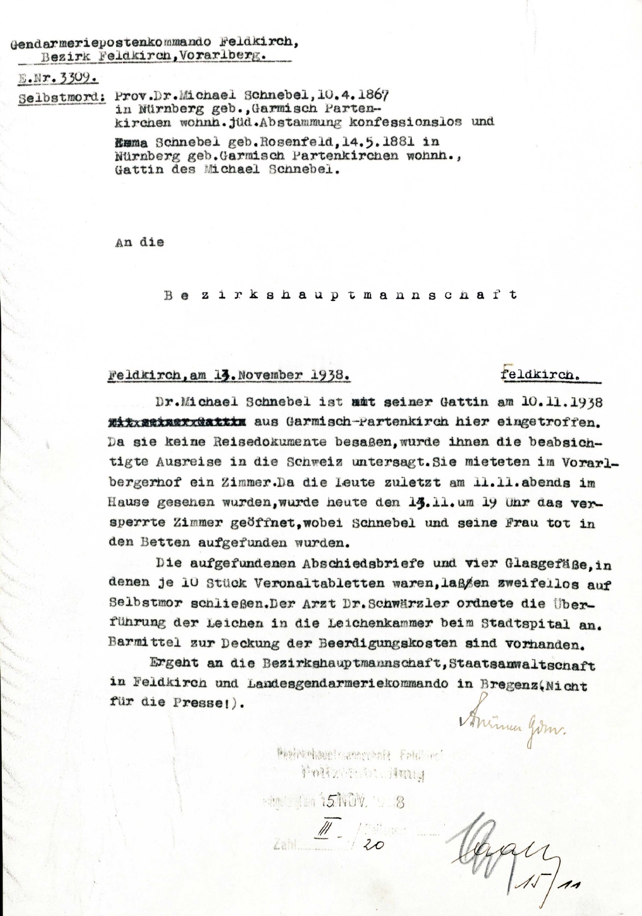 Dr. Michael Schnebel ist mit seiner Gattin am 10.11.1938 aus Garmisch-Partenkirchen hier eingetroffen. Da sie keine Reisedokumente besaßen, wurde ihnen die beabsichtigte Ausreise in die Schweiz untersagt. Sie mieten im Vorarlbergerhof ein Zimmer. Da die Leute zuletzt am 11.11. abends im Hause gesehen wurden, wurde heute den 13.11. um 19 Uhr das versperrte Zimmer geöffnet, wobei Schnebel und seine Frau tot in den Betten aufgefunden wurden.