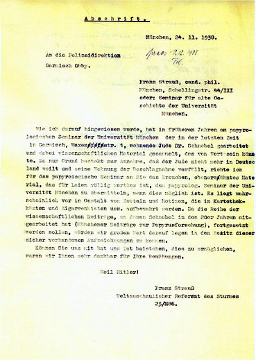 „Wie ich darauf hingewiesen wurde, hat in früheren Jahren am papyrologischen Seminar der Universität München der in der letzten Zeit in Garmisch, Waxensteinstr. 1, wohnende Jude Dr. Schnebel gearbeitet und dabei wissenschaftliches Material gesammelt, das von Wert sein könnte. Da nun Grund besteht zur Annahme, daß der Jude nicht mehr in Deutschland weilt und seine Wohnung der Beschlagnahme verfällt, richte ich für das papyrologische Seminar an Sie das Ersuchen, obenerwähntes Material, das für Laien völlig wertlos ist, dem papyrolog. Seminar der Universität München zu übermitteln, wenn dies möglich ist. Es liegt wahrscheinlich vor in Gestalt von Zetteln und Notizen, die in Karthothekkästen und Zigarrenkisten usw. aufbewahrt werden. Da die Reihe der wissenschaftlichen Beiträge, an denen Schnebel in den 20er Jahren mitgearbeitet hat (Münchener Beiträge zur Papyrusforschung), fortgesetzt werden sollen, würden wir großen Wert darauf legen in den Besitz dieser sicher vorhandenen Aufzeichnungen zu kommen. Können Sie uns mit Rat und Tat beistehen, dies zu ermöglichen, wären wir Ihnen sehr dankbar für Ihre Bemühungen. Heil Hitler!“