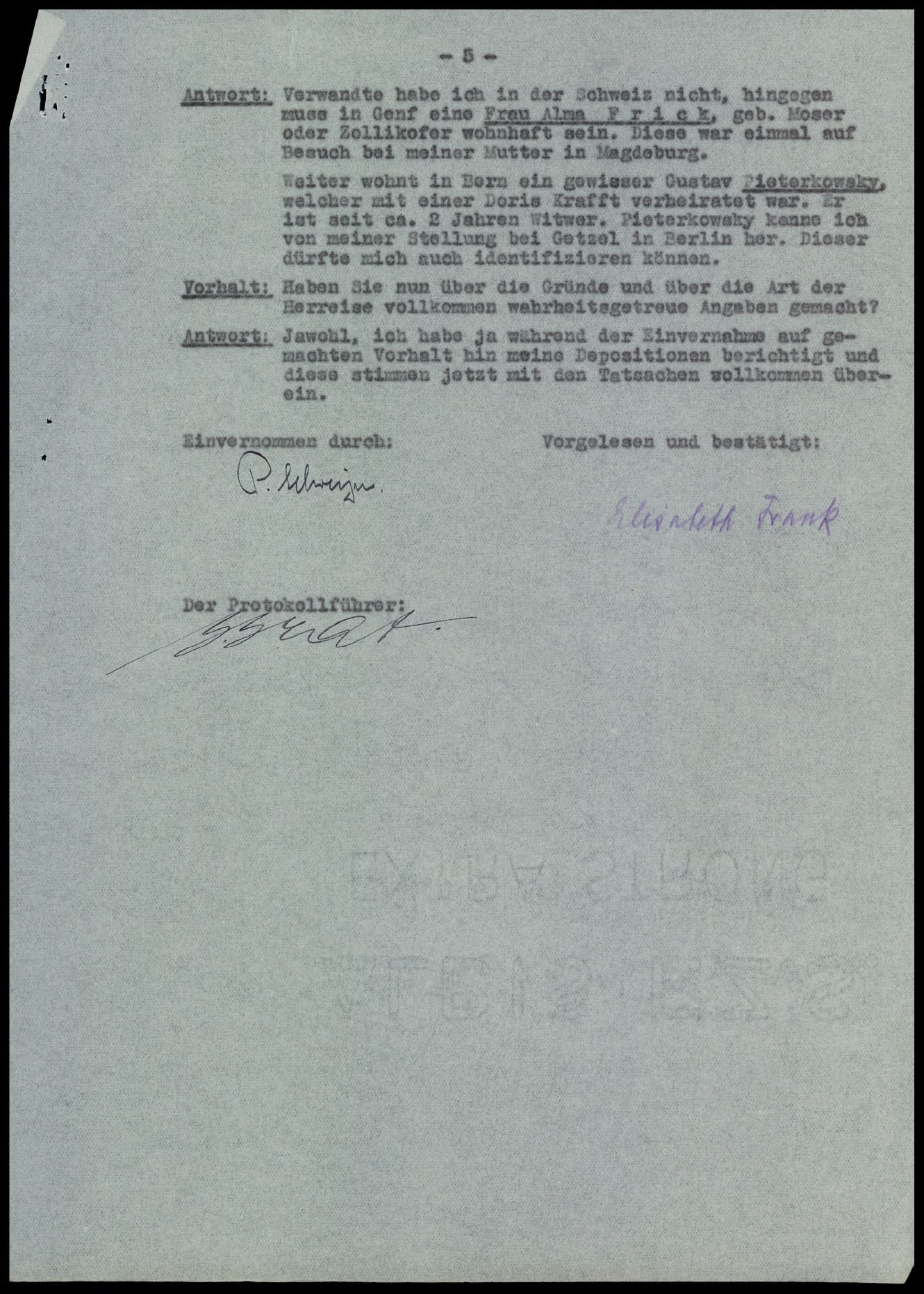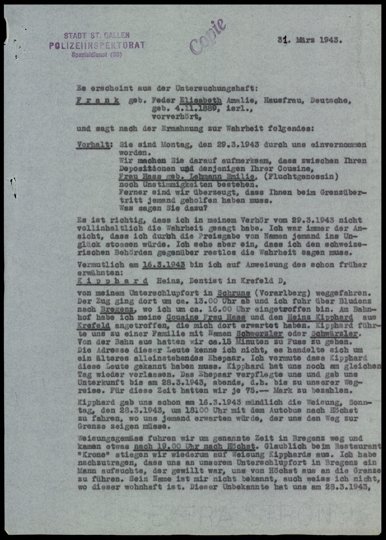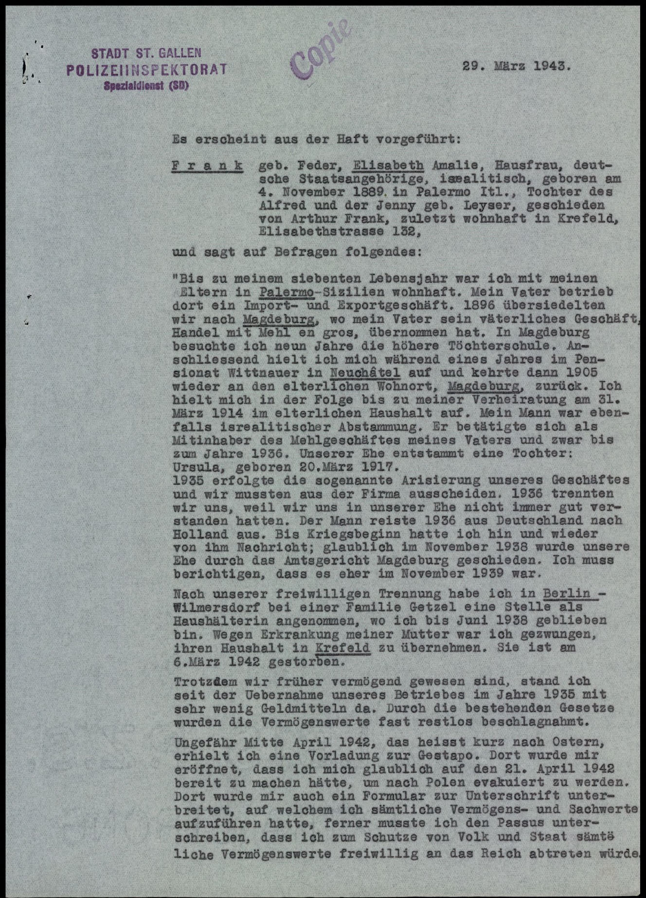 [1] Polizeiinspektorat St. Gallen, Verhörprotokoll Elisabeth Frank, 29. März 1943, Schweizerisches Bundesarchiv, Dossier Elisabeth Frank.