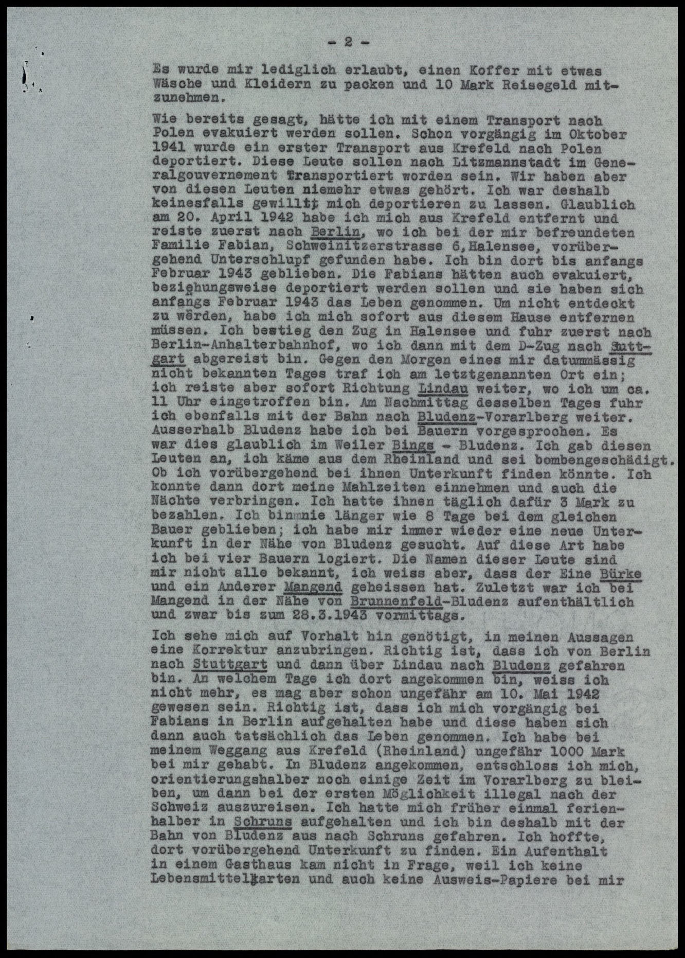 „Dort wurde mir eröffnet, dass ich mich glaublich auf den 21. April 1942 bereit zu machen hätte, um nach Polen evakuiert zu werden. Dort wurde mir auch ein Formular zur Unterschrift unterbreitet, auf welchem ich sämtliche Vermögens- und Sachwerte aufzuführen hatte, ferner musste ich den Passus unterschreiben, dass ich zum Schutze von Volk und Staat sämtliche Vermögenswerte freiwillig an das Reich abtreten würde. Es wurde mir lediglich erlaubt, einen Koffer mit etwas Wäsche und Kleidern zu packen und 10 Mark Reisegeld mitzunehmen.“[1]
