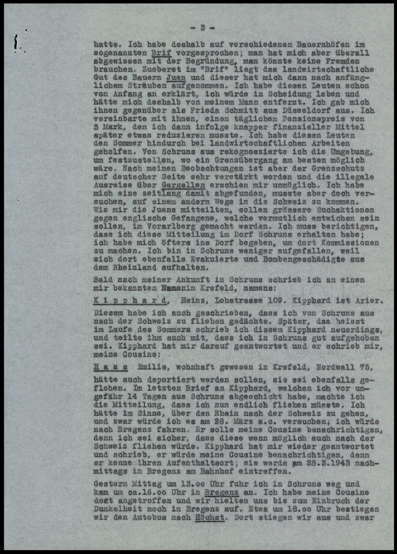 Mit Kipphardt ist sie noch immer in Kontakt. Und der sucht inzwischen auch einen rettenden Weg für ihre Cousine, Emilie Haas. Mitte März 1943 treffen sie zu dritt in Bregenz zusammen. Eine Familie Schwärzler nimmt die beiden Frauen einige Tage auf, dann machen sie sich mit einem Schlepper am Abend des 28. März von Höchst aus über den Alten Rhein auf den Weg in die Schweiz.