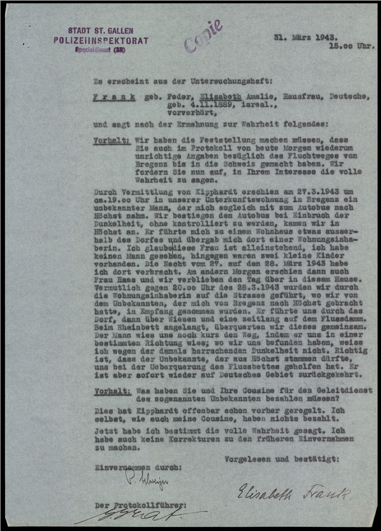 Am nächsten Morgen werden sie in St. Gallen verhört, und dann noch zweimal, denn sie verheddern sich in Widersprüchen, um ihre Helfer nicht preiszugeben. Dann lassen es die Beamten gut sein. Anfang Mai wird Elisabeth Frank ins Flüchtlingslager Oberhelfenschwil eingeliefert. Am 25. Mai entscheidet die Fremdenpolizei: