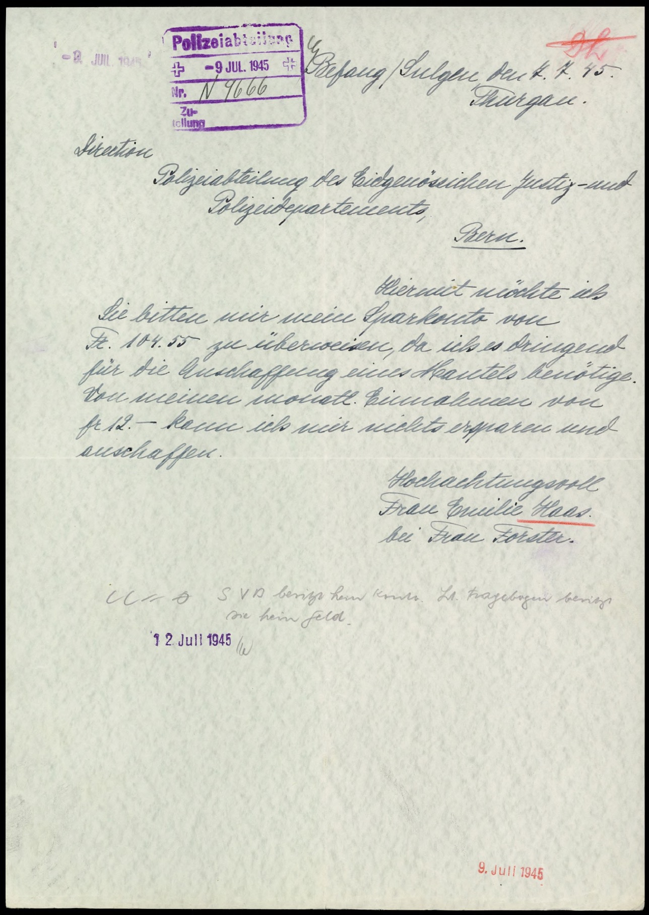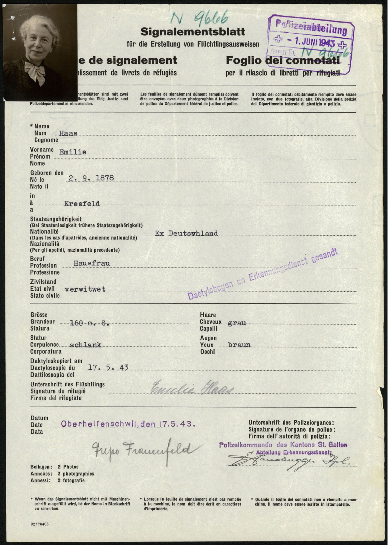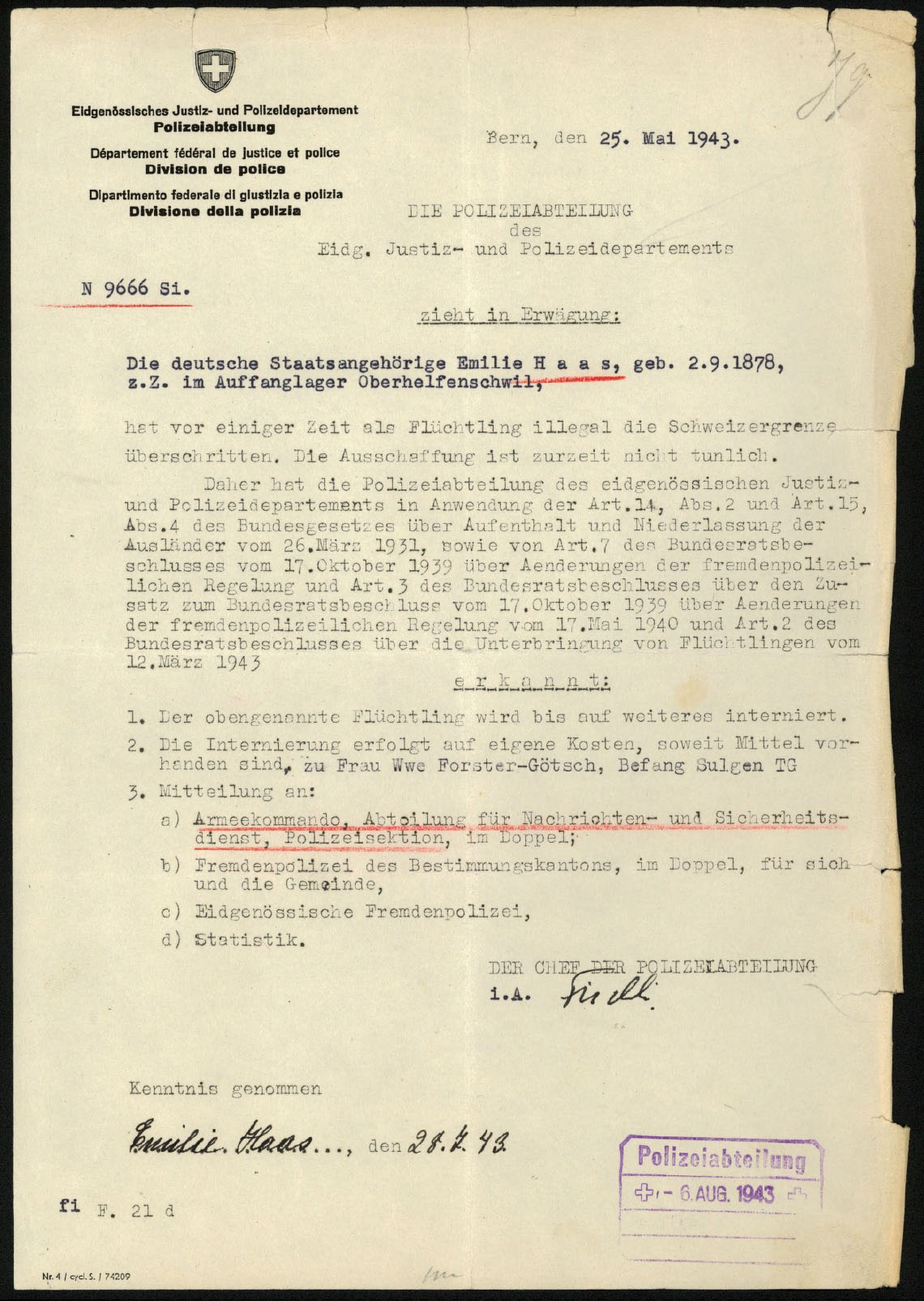 [1] Verhörprotokoll Emilie Haas, St. Gallen, 29.3.1943, Dossier zu Emilie Haas; Schweizerisches Bundesarchiv, Bern