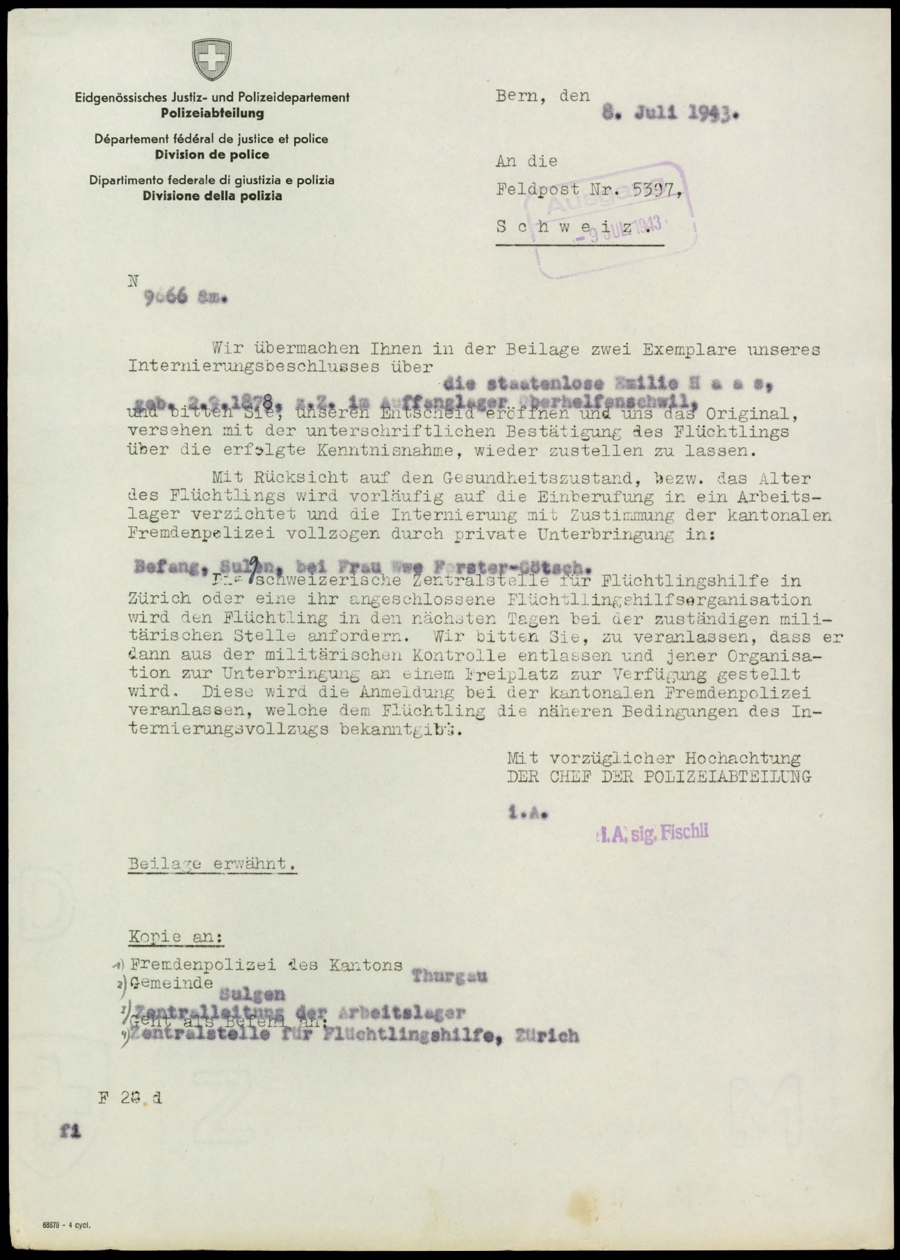 Zunächst im Flüchtlingslager Oberhelfenschwil interniert, wird die 65-jährige noch im Frühjahr als „nicht arbeitslagertauglich“ eingestuft – und an ein Privatquartier in Sulgen im Thurgau überwiesen. Dort wird sie den Rest ihres Lebens verbringen.
