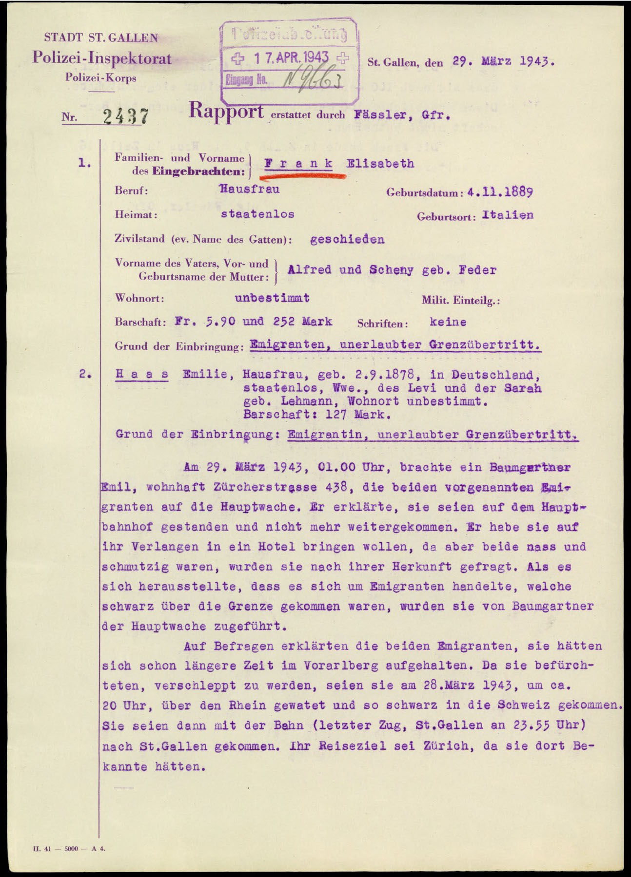 „Am 29. März 1943, 01.00 Uhr, brachte ein Baumgartner Emil, wohnhaft Zürcherstrasse 438, die beiden vorgenannten Emigranten auf die Hauptwache. Er erklärte, sie seien auf dem Hauptbahnhof gestanden und nicht mehr weitergekommen. Er habe sie auf ihr Verlangen in ein Hotel bringen wollen, da aber beide nass und schmutzig waren, wurden sie nach ihrer Herkunft gefragt. Als es sich herausstellte, dass es sich um Emigranten handelte, welche schwarz über die Grenze gekommen waren, wurden sie von Baumgartner der Hauptwache zugeführt.